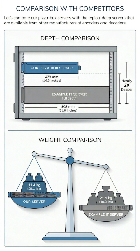 The image on the right compares our pizza-box servers with the typical deep servers that are available from other manufacturers of encoders and decoders.